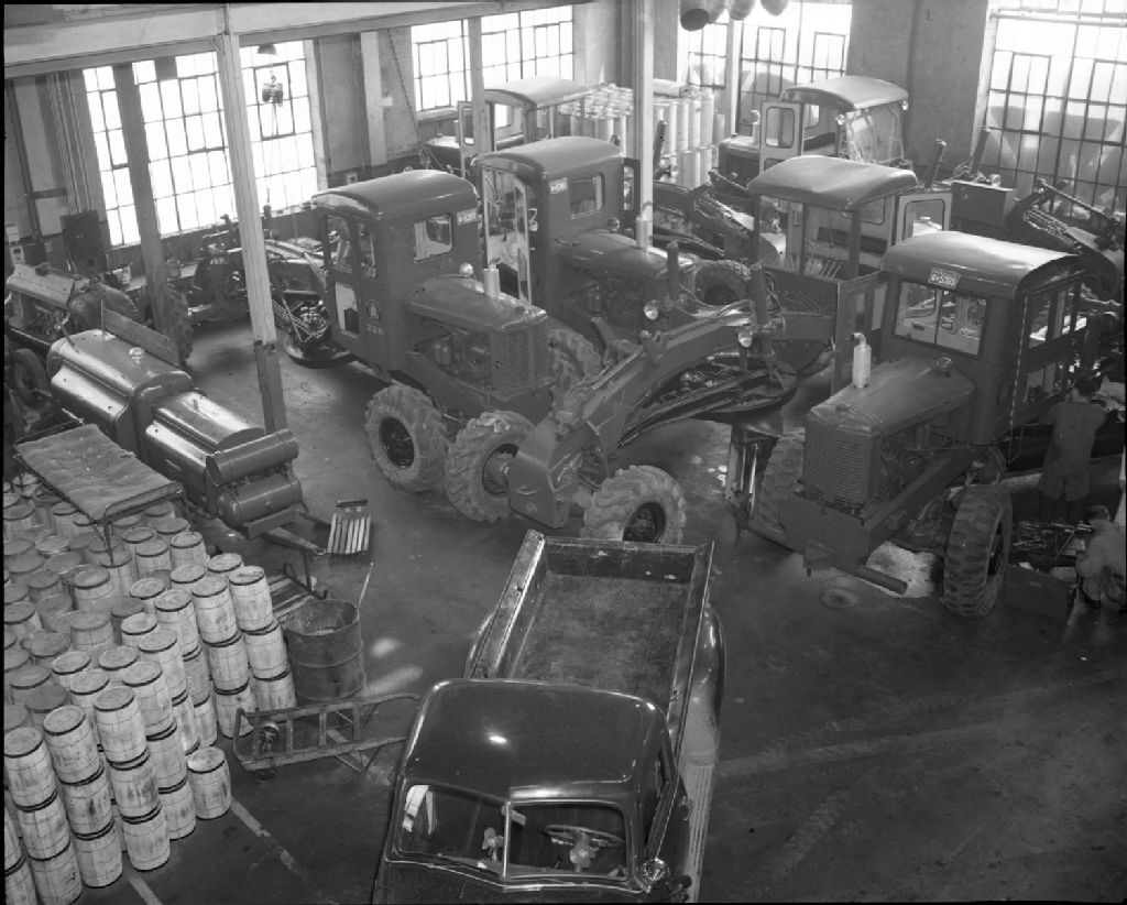 Section des niveleuses. Pelles mécaniques et compresseur. Entrepôt de Saint-Malo