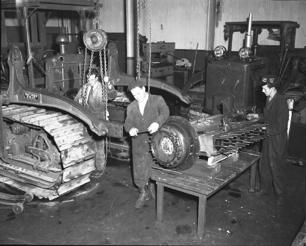 Section de la réparation des tracteurs. De gauche à droite : Armand Pelchat, aide; Fernand Proulx, mécanicien; Jean-Roch Guay, aide-mécanicien. Entrepôt de Saint-Malo