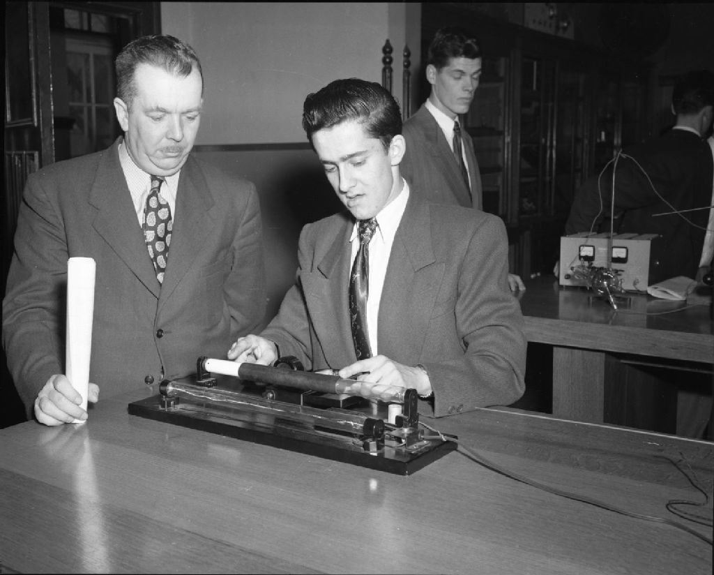 Visite par des industriels et le public. École technique de Québec, 1950, Archives nationales à Québec, Fonds Ministère de la Culture et des Communications, (03Q,E6,S7,SS1,D2,P76043), Neuville Bazin.