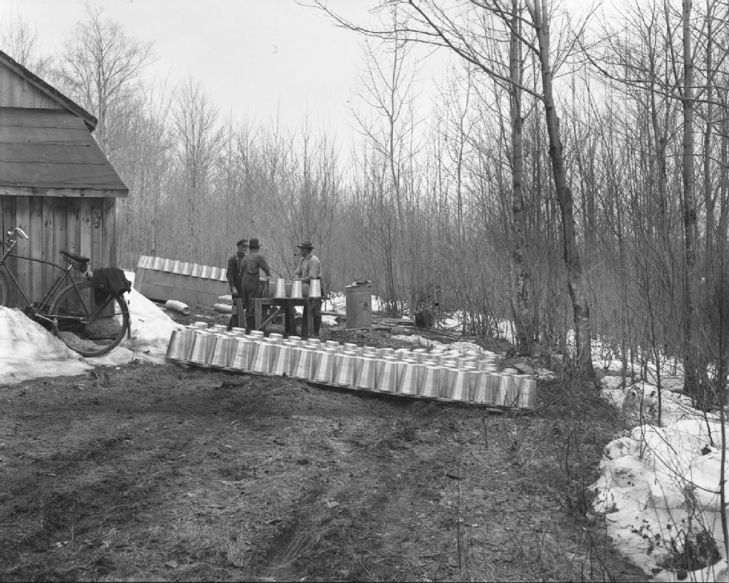 Érablière Vallière, nettoyage des chaudières. Sainte-Catherine, comté Portneuf, 1950, Archives nationales à Québec, Fonds Ministère de la Culture et des Communications, (03Q,E6,S7,SS1,D2,P76076), J.W. Michaud.