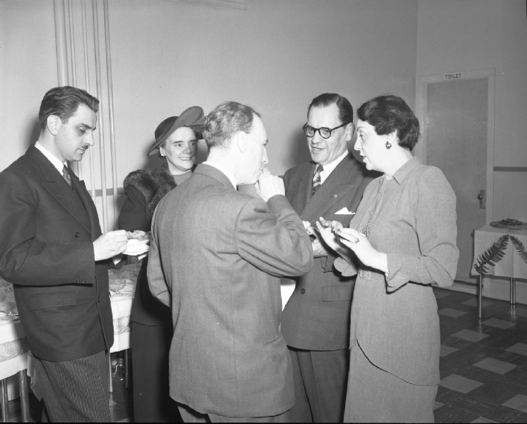 Cours d'hôtellerie au Manoir des Ormes. André Giroux, monsieur et madame G. O. Poulin, Lucien Jinchereau et mademoiselle A. Ste-Marie, ménagère enseignante. Beauceville, 1950, Archives nationales à Québec, Fonds Ministère de la Culture et des Communications, (03Q,E6,S7,SS1,D2,P76401), Neuville Bazin.