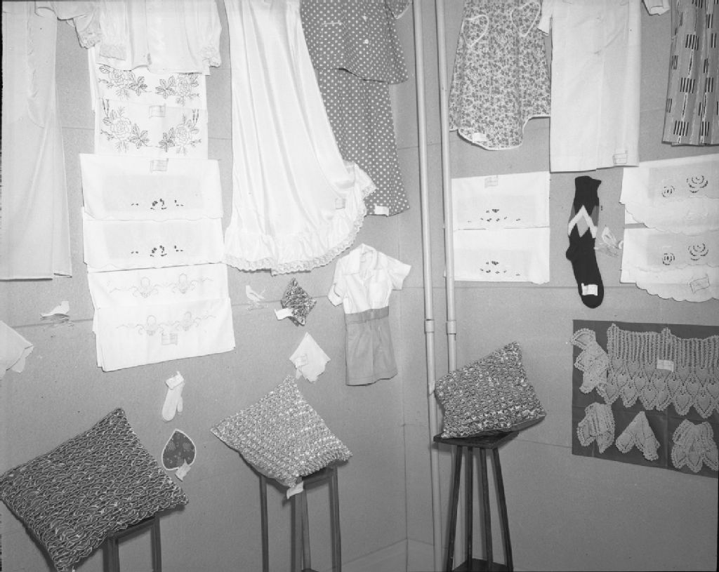 Coin des coussins et broderies. Salle d'exposition du postscolaire. Sainte-Thérèse-de-Lisieux, comté de Québec