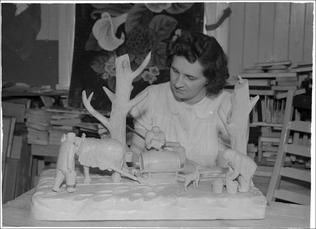 Mademoiselle Bolduc faisant de la sculpture sur bois à Baie-Saint-Paul, 1942, Archives nationales à Québec, Fonds Ministère de la Culture et des Communications, (03Q,E6,S7,SS1,D2,P7668), Herménégilde Lavoie.