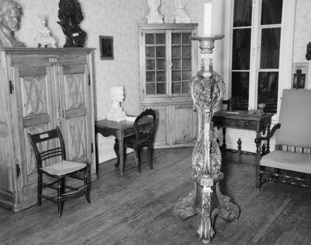 Musée Laurier. Salle canadienne (anciennement la chambre à coucher de Lady Laurier). Au centre, magnifique cierge pascal en bois sculpté attribué à Finsterer. Arthabaska, 1950, Archives nationales à Québec, Fonds Ministère de la Culture et des Communications, (03Q,E6,S7,SS1,D2,P76894), Neuville Bazin.