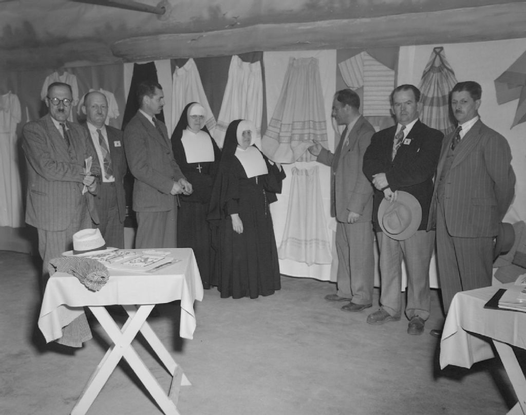 Jeunes agriculteurs de Bellechasse et Dorchester à l'Institut de Saint-Damien. Mère supérieure et Mère économe accompagnant un groupe d'officiels pour la visite des travaux de l'exposition de l'École ménagère. Mère économe fait admirer un exhibit de toile à l'agronome Bélanger. Saint-Damien, comté de Bellechasse