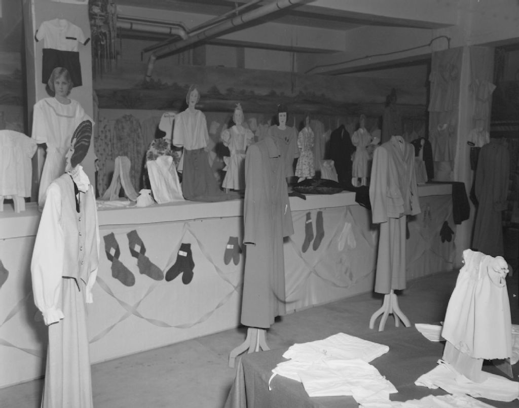 Jeunes agriculteurs de Bellechasse et Dorchester à l'Institut de Saint-Damien. Coin de l'exposition « La confection ». Saint-Damien, comté de Bellechasse, 1950, Archives nationales à Québec, Fonds Ministère de la Culture et des Communications, (03Q,E6,S7,SS1,D2,P77016), Neuville Bazin.