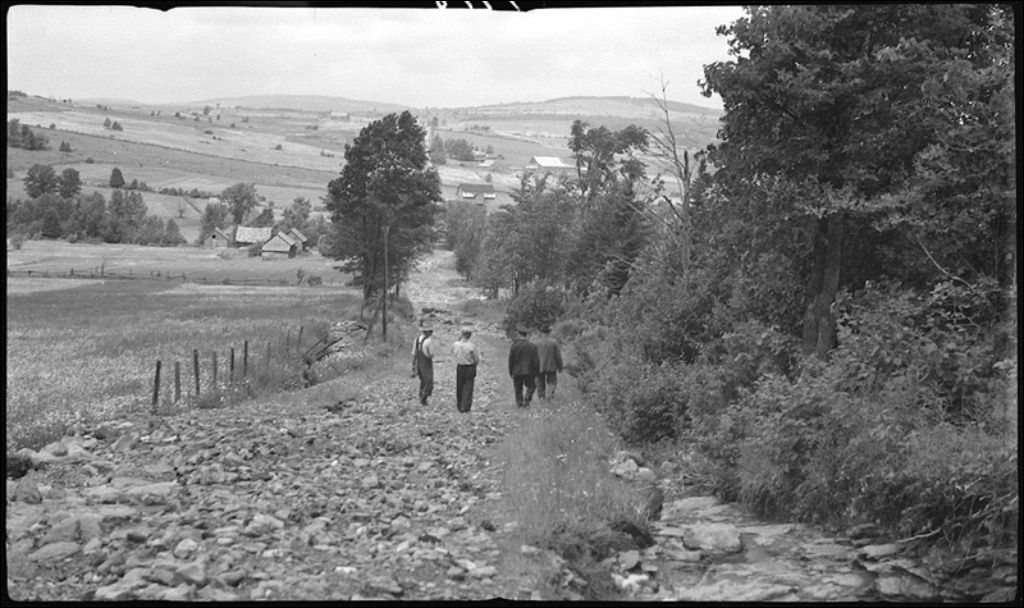 Chemin vis-à-vis des lots 7 à 9 à Saint-Julien, canton Wolfe, 1942, Archives nationales à Québec, Fonds Ministère de la Culture et des Communications, (03Q,E6,S7,SS1,D2,P7718), Irénée Beaudet.