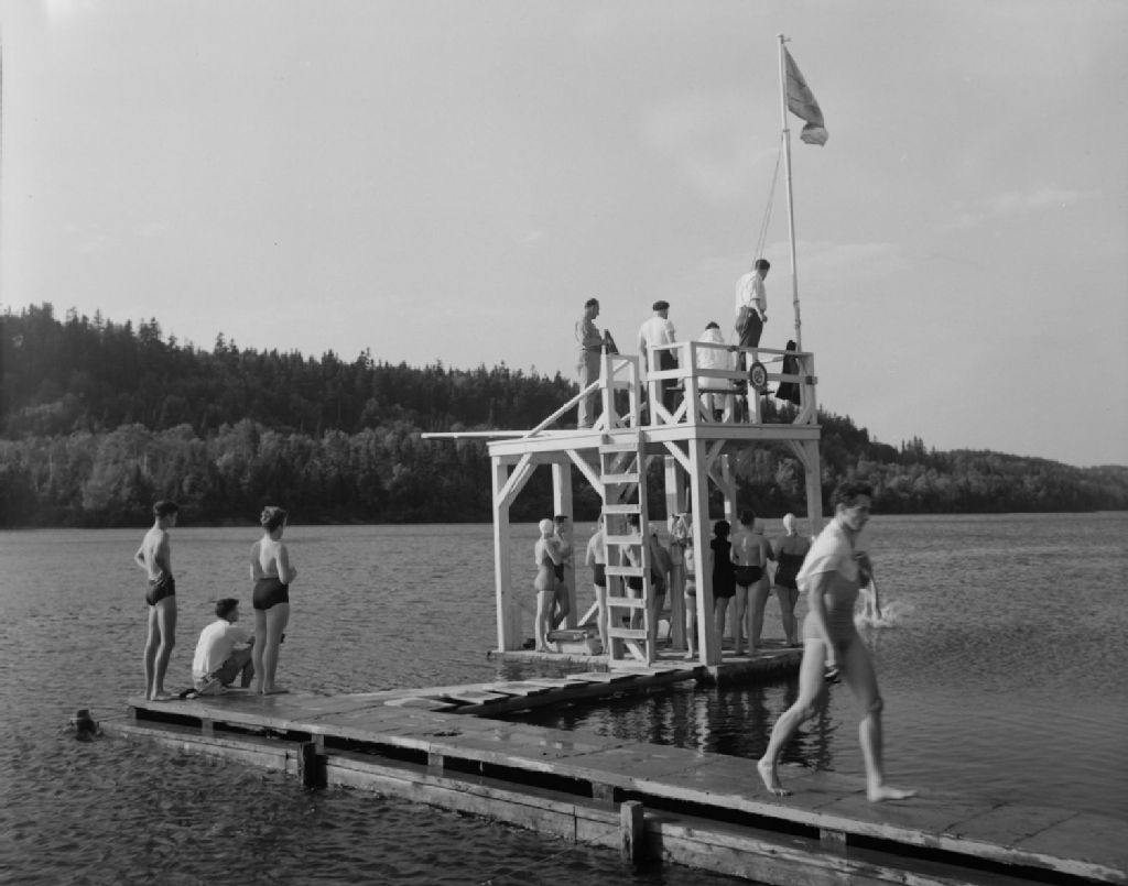 Au tremplin au lac Trois-Saumons, 1950, Archives nationales à Québec, Fonds Ministère de la Culture et des Communications, (03Q,E6,S7,SS1,D2,P77374), Neuville Bazin.