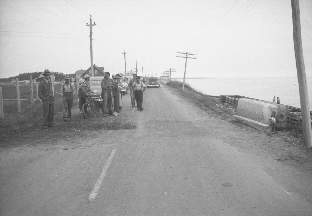 Route no. 6 et approches de la route. Dossier après accident de la route avec autobus Baie-des-Chaleurs. Bonaventure., 1950, Archives nationales à Québec, Fonds Ministère de la Culture et des Communications, (03Q,E6,S7,SS1,D2,P77604), Maurice Gravel.