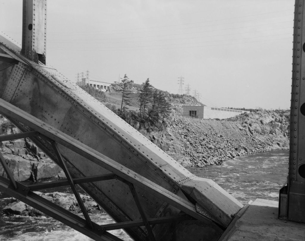 Inauguration, par le premier ministre Maurice Duplessis, du pont d'aluminium d'Arvida au dessus de la rivière Saguenay à l'usine ShipShaw no 2., 1950, Archives nationales à Québec, Fonds Ministère de la Culture et des Communications, (03Q,E6,S7,SS1,D2,P77701), Neuville Bazin.