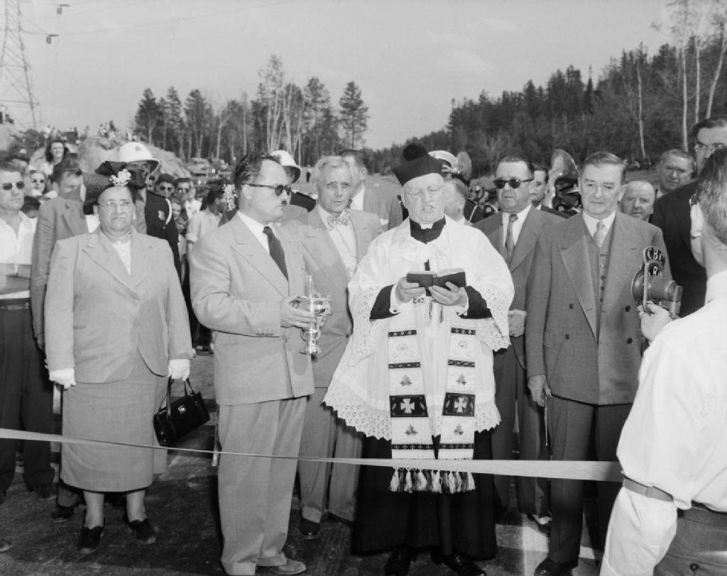Inauguration, par le premier ministre Maurice Duplessis, du pont d'aluminium d'Arvida au dessus de la rivière Saguenay à l'usine ShipShaw no 2., 1950, Archives nationales à Québec, Fonds Ministère de la Culture et des Communications, (03Q,E6,S7,SS1,D2,P77703), Neuville Bazin.