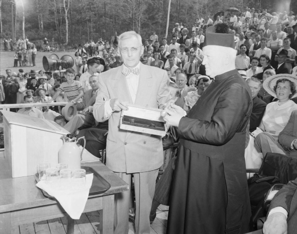 Inauguration, par le premier ministre Maurice Duplessis, du pont d'aluminium d'Arvida au dessus de la rivière Saguenay à l'usine ShipShaw no 2., 1950, Archives nationales à Québec, Fonds Ministère de la Culture et des Communications, (03Q,E6,S7,SS1,D2,P77710), Neuville Bazin.