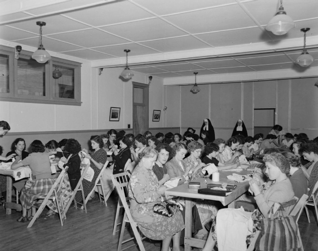 Groupe de 58 élèves du cours du Cercle des fermières de la Fédération gaspésienne, donné à l'École des pêcheries de Grande-Rivière du 27 juin au 26 juillet 1950