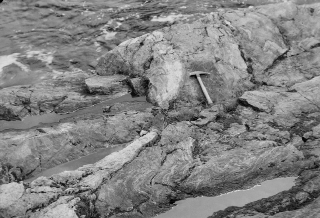 Contorded injection gneiss probably representing intrusion of granite into older sediments volcanic belt, Takwa river 720-30, 510-27,Mistassini territory