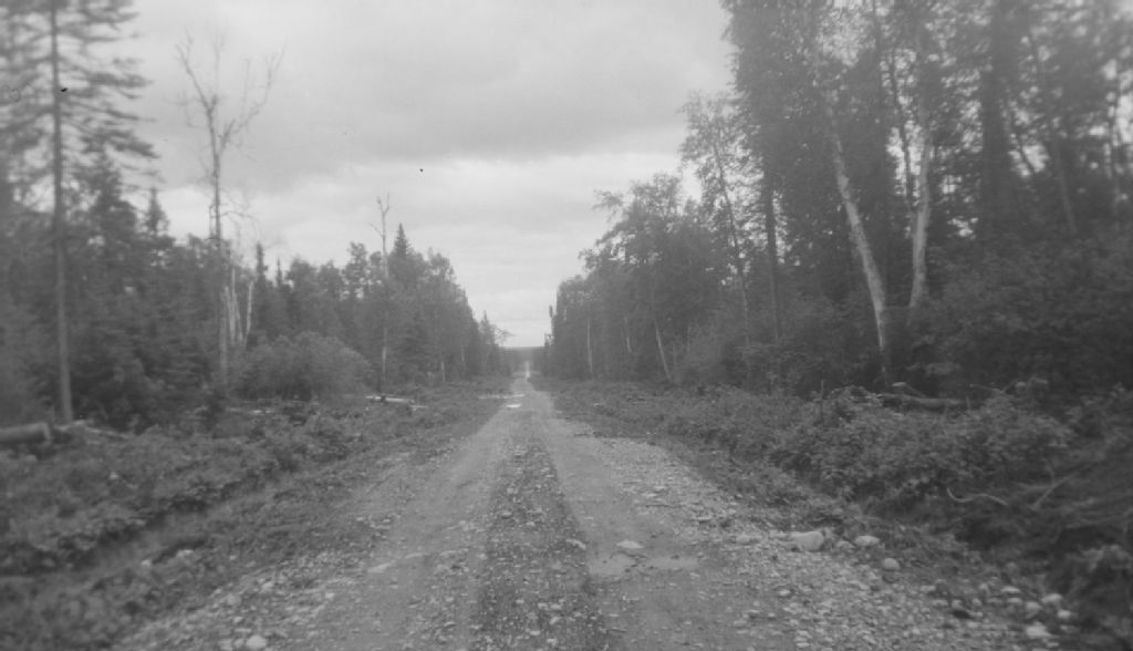 Vue du chemin en réparation. Chemin Senneterre. Lac Madeleine., 1950, Archives nationales à Québec, Fonds Ministère de la Culture et des Communications, (03Q,E6,S7,SS1,D2,P78436), Serge Godbout.