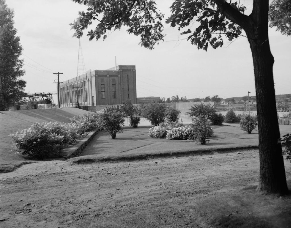 Jardins de la centrale électrique Hemming Falls à Drummondville, 1950, Archives nationales à Québec, Fonds Ministère de la Culture et des Communications, (03Q,E6,S7,SS1,D2,P78652), Paul Carpentier.