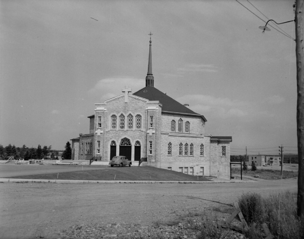 Église Saint-Jean-Bosco à Magog, 1950, Archives nationales à Québec, Fonds Ministère de la Culture et des Communications, (03Q,E6,S7,SS1,D2,P78680), Paul Carpentier.