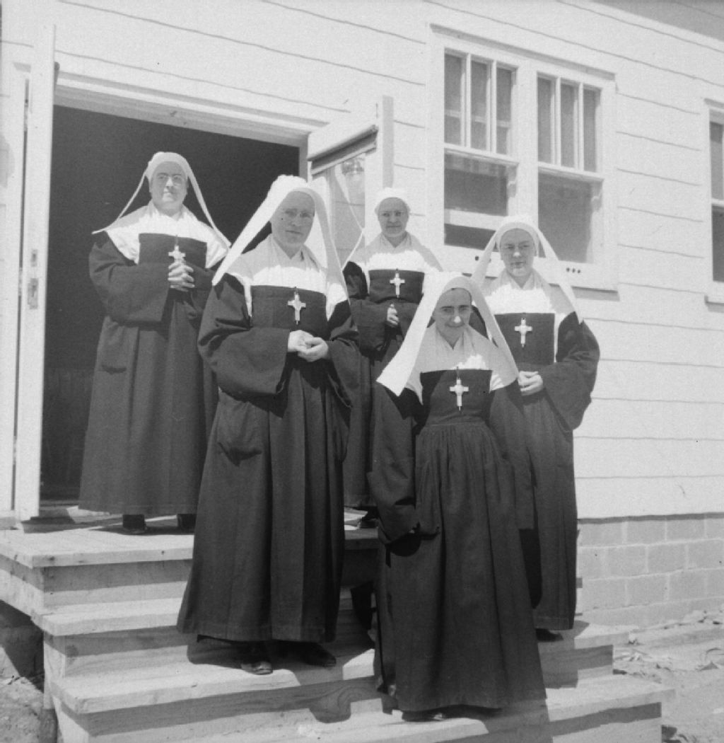 Les religieuses de l'école centrale de Despinassy arrivées le 19 juillet 1950.Deux de ce groupe: Mère Marie-Lucille supérieure et soeur Saint-Richerd sont en permanence:viendront dans deux semaines soeur Marie-Elphège et soeur Roger du Sacré-coeur cuisinières. Ces filles de la charité du Sacré-Coeur sont parties de Beaucanton, Despinassy, Abitibi-est