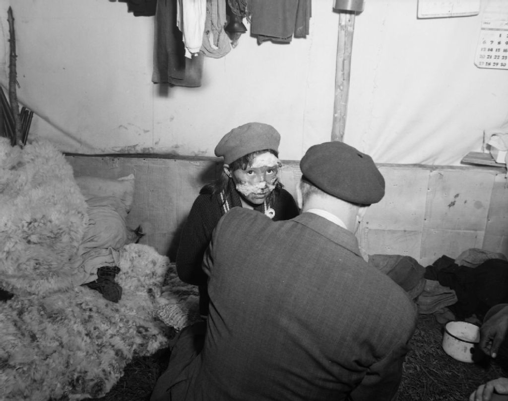 L'Honorable Camille-Eugène Pouliot, ministre de la Chasse et des Pêcheries, panse les brûlures d'une amériendienne blessée en allumant une lampe à pètrole au Grand Lac Mistassini
