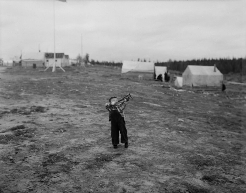 Jeune amérindien Cris avec sa fronde au Grand Lac Mistassini, 1950, Archives nationales à Québec, Fonds Ministère de la Culture et des Communications, (03Q,E6,S7,SS1,D2,P79072), Gustave Bédard.