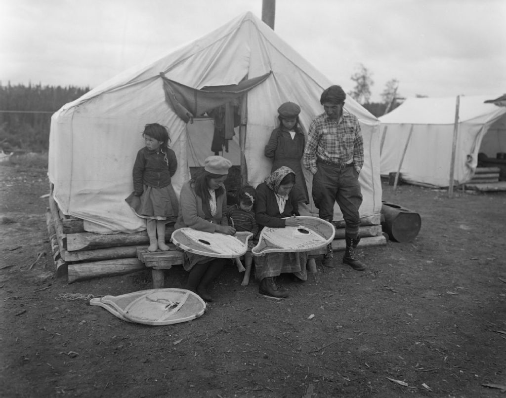 Groupe d'amérindiens Cris fabricant des raquettes pour la chasse d'hiver, Grand Lac Mistassini