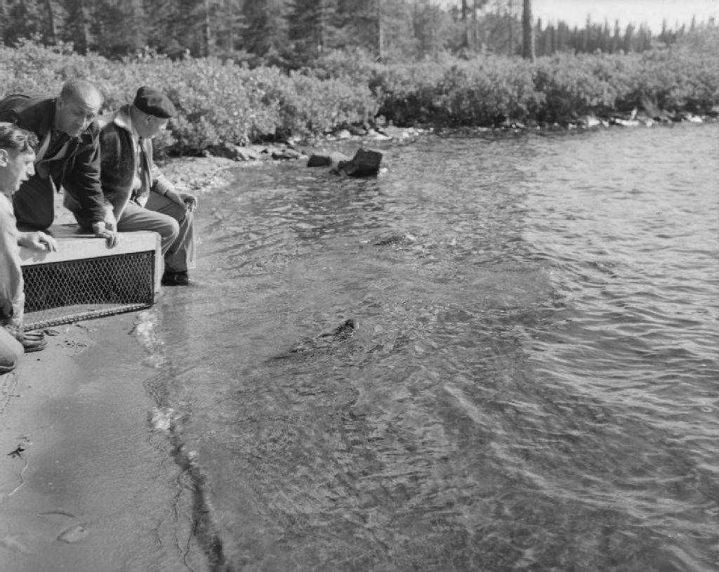 Transport aérien des castors devant être libérés dans les eaux de la réserve Mistassini, Grand Lac Mistassini, 1950, Archives nationales à Québec, Fonds Ministère de la Culture et des Communications, (03Q,E6,S7,SS1,D2,P79092), Gustave Bédard.