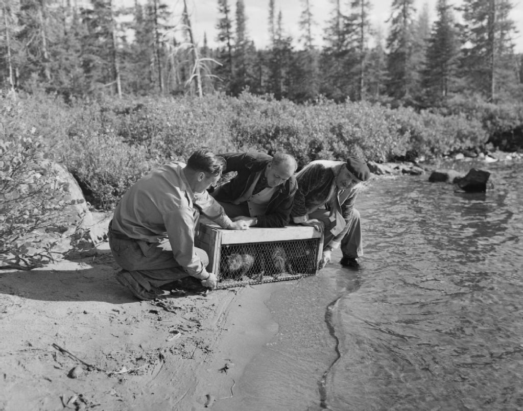 Monsieur Hugh Coun, du ministère des Affaires indiennes d'Ottawa, monsieur J. Armand Tremblay et l'Honorable Camille-Eugène Pouliot, libèrent des castors dans les eaux de la réserve Mistassini, Grand Lac Mistassini, 1950, Archives nationales à Québec, Fonds Ministère de la Culture et des Communications, (03Q,E6,S7,SS1,D2,P79094), Gustave Bédard.