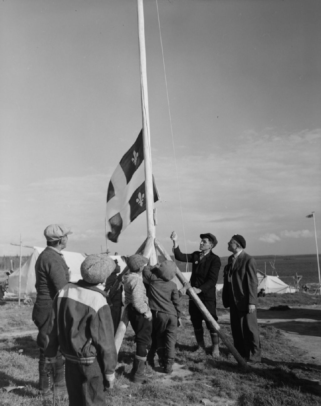 Le fleurdelysé est hissé devant la tente du chef amérindiens Cris, Shecapio au Grand Lac Mistassini, 1950, Archives nationales à Québec, Fonds Ministère de la Culture et des Communications, (03Q,E6,S7,SS1,D2,P79095), Gustave Bédard.