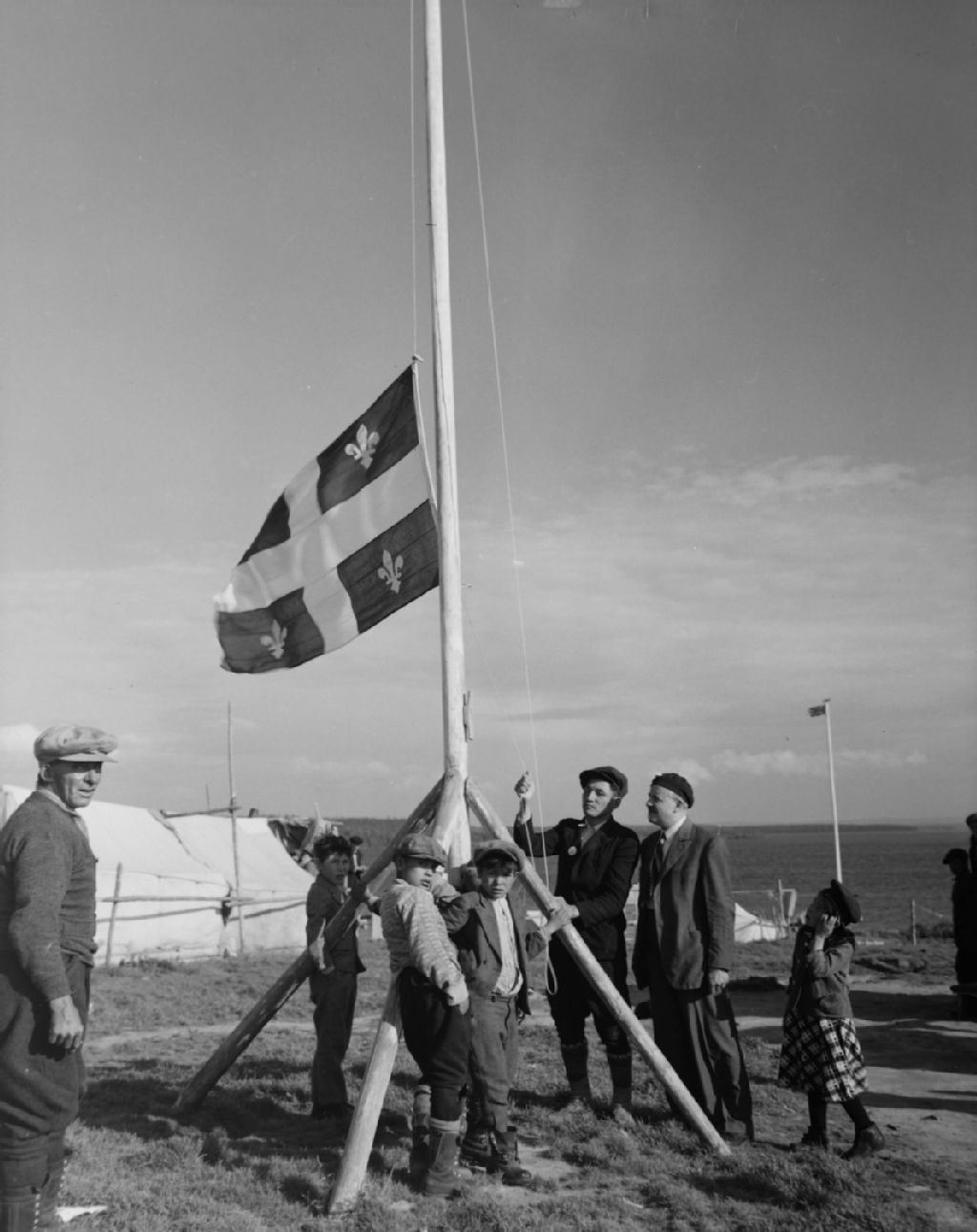 Le chef "Shecapio" de la tribu Cris du Grand Lac Mistassini hisse le fleurdelysé, que lui a présenté l'Honorable Camille-Eugène Pouliot au nom du gouvernement de la province au Grand Lac Mistassini
