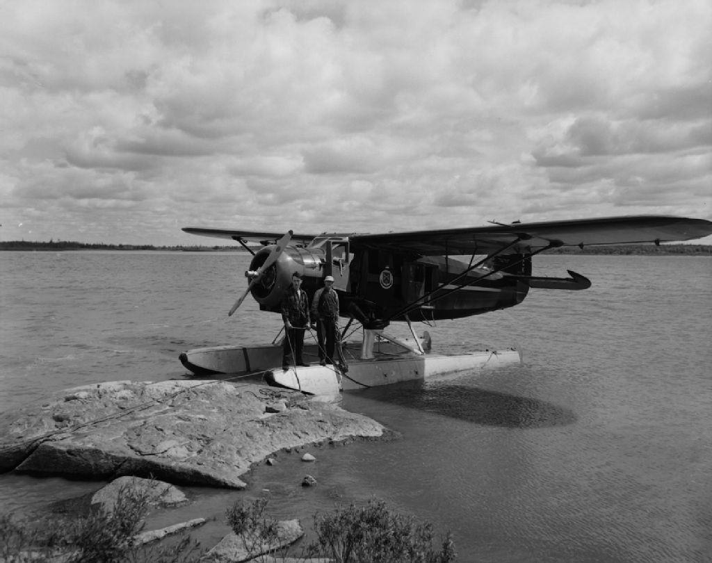 L'hydravion de type Norseman qui transportait le Docteur Camille-Eugène Pouliot et son groupe. On remarque A. Trembgay du Service des fourrures et Gustave Bédard des Relations extérieures au ministère de la Chasse et de la Pêche, Grand Lac Mistassini