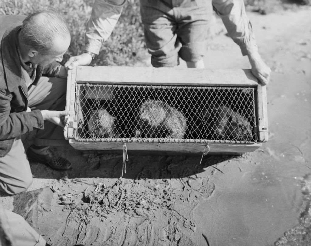 Le docteur Camille-Eugène Pouliot en compagnie de messieurs Hugh Coun du ministère des Affaires indiennes d'Ottawa et d'Armand Tremblay, directeur du Service des fourrures au provincial, s'apprêtent à libérer des castors dans la réserve de Mistassini après les avoir transportés par hydravion de la réserve Nottaway en production. Cette mesure accélère la production des castors dans la nouvelle réserve, Grand Lac Mistassini
