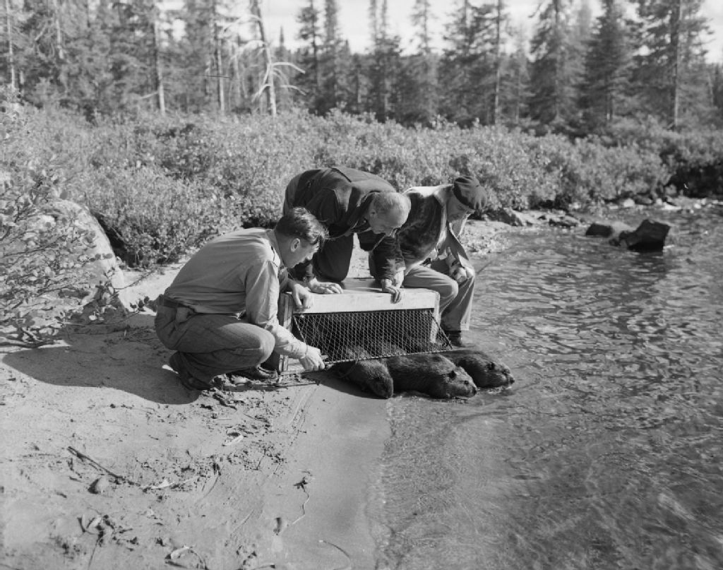 Le docteur Camille-Eugène Pouliot en compagnie de messieurs Hugh Coun du ministère des Affaires indiennes d'Ottawa et d'Armand Tremblay, directeur du Service des fourrures au provincial, s'apprêtent à libérer des castors dans la réserve de Mistassini après les avoir transportés par hydravion de la réserve Nottaway en production. Cette mesure accélère la production des castors dans la nouvelle réserve, Grand Lac Mistassini