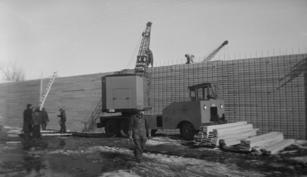 Construction d'un viaduc en béton armé à Saint-Télésphore. Coffrage et mise en place de l'armature. comté de Lévis, 1951, Archives nationales à Québec, Fonds Ministère de la Culture et des Communications, (03Q,E6,S7,SS1,D2,P79455), Jules Carbonneau.