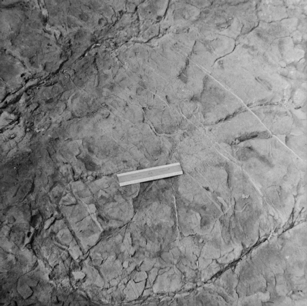 Perisotite showing typical westhed surface and small asbestiform (amphibole) veinlets, Lot XVI R.II. Pascalais Twp