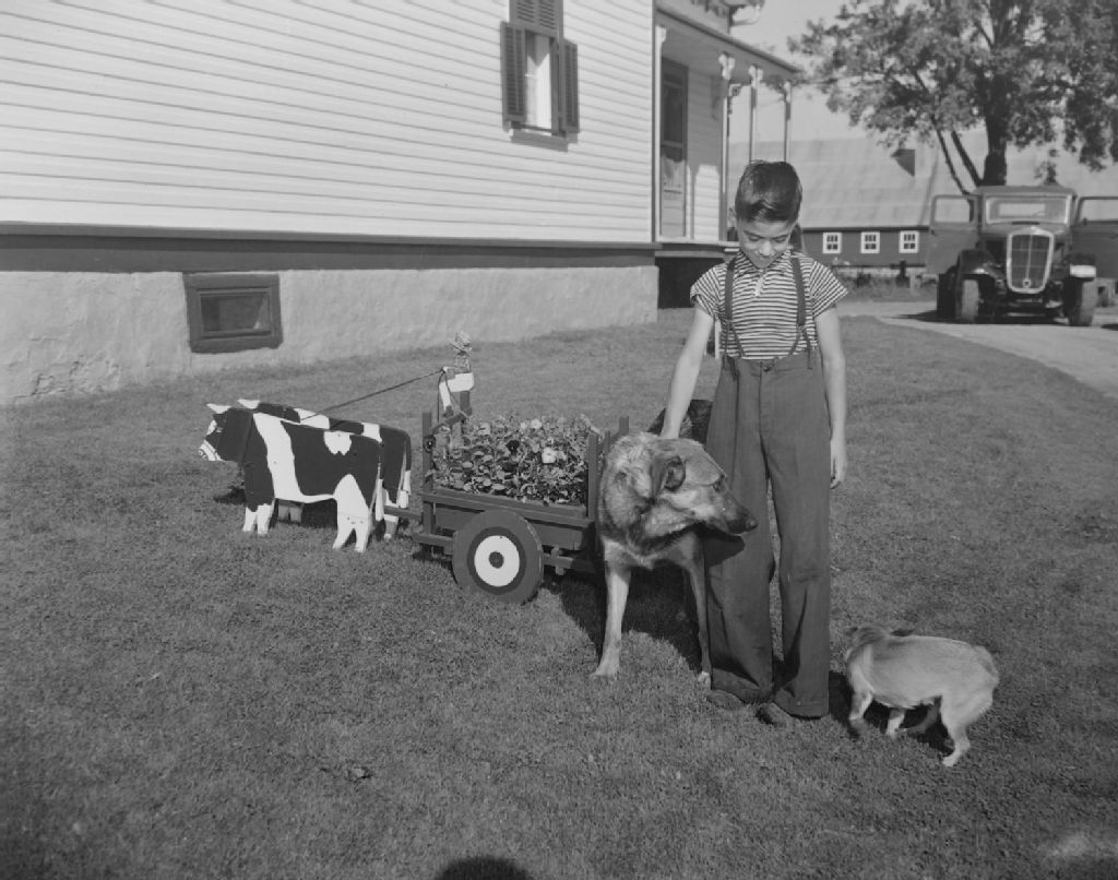 Le petit Leroux dans le parterre et l'attelage de boeufs servant de boîte à fleurs à Saint-Clet., 1950, Archives nationales à Québec, Fonds Ministère de la Culture et des Communications, (03Q,E6,S7,SS1,D2,P79740), Omer Beaudoin.