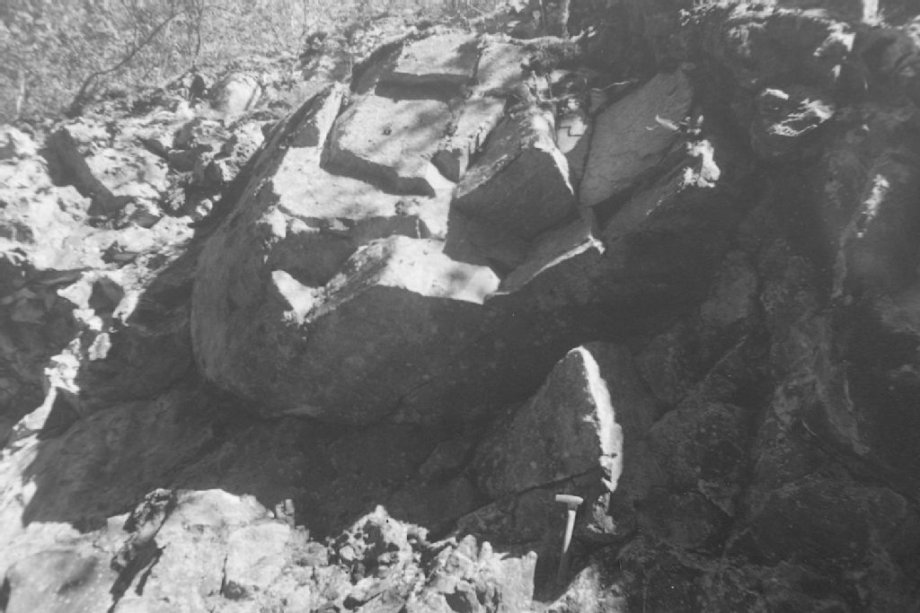 Large boulder or gneiss in uppermost conglomerate. Waconichi series, Waconichi lake. O'Sullivan Twp.., 1950, Archives nationales à Québec, Fonds Ministère de la Culture et des Communications, (03Q,E6,S7,SS1,D2,P79807), J. E. Gilbert.