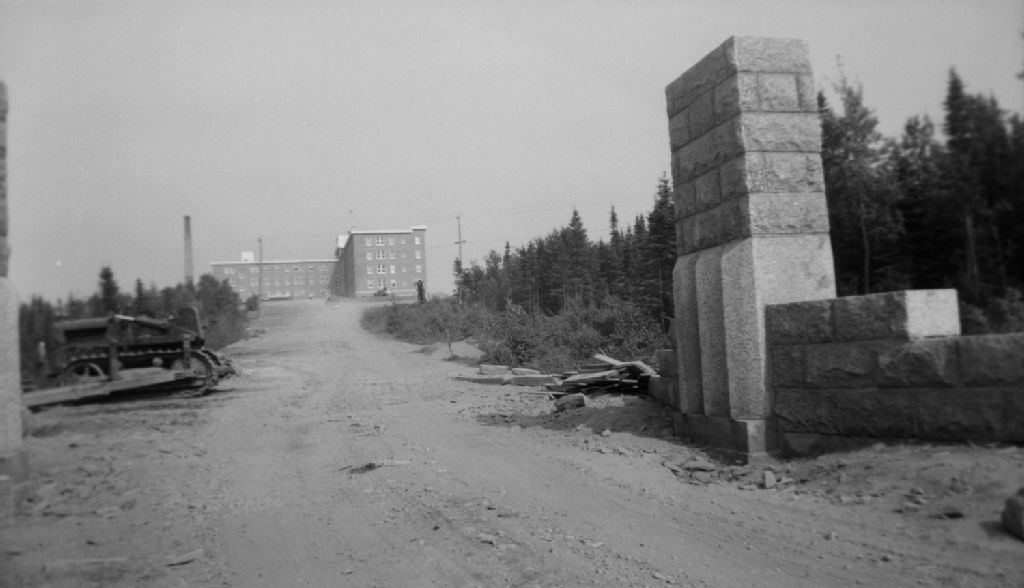 Approches de l'entrée du Sanatorium de Gaspé, Gaspé, comté de Gaspé-Sud, 1950, Archives nationales à Québec, Fonds Ministère de la Culture et des Communications, (03Q,E6,S7,SS1,D2,P79844), Jean Bastien.