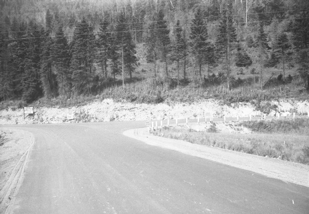 Intersection de la route numéro 6 et la route interprovinciale, Saint-Laurent, comté de Matapédia, 1950, Archives nationales à Québec, Fonds Ministère de la Culture et des Communications, (03Q,E6,S7,SS1,D2,P79853), Jean Bastien.
