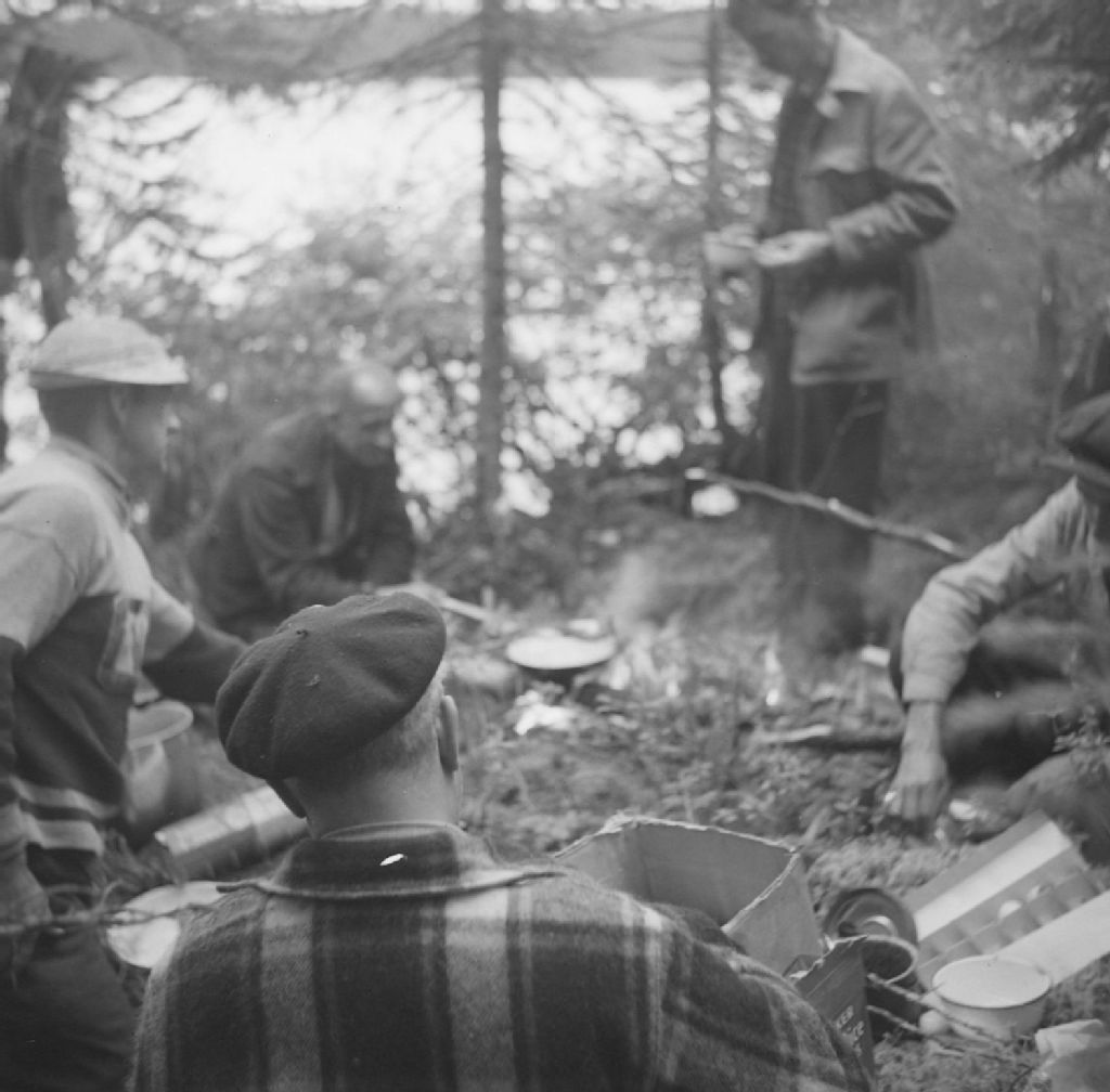 L'hydravion de type Norseman sur la rivière Rupert pendant que l'honorable Camille-Eugène Pouliot, messieurs Gustave Bédard et Armand Tremblay cassent la croûte. Grand Lac Mistassini