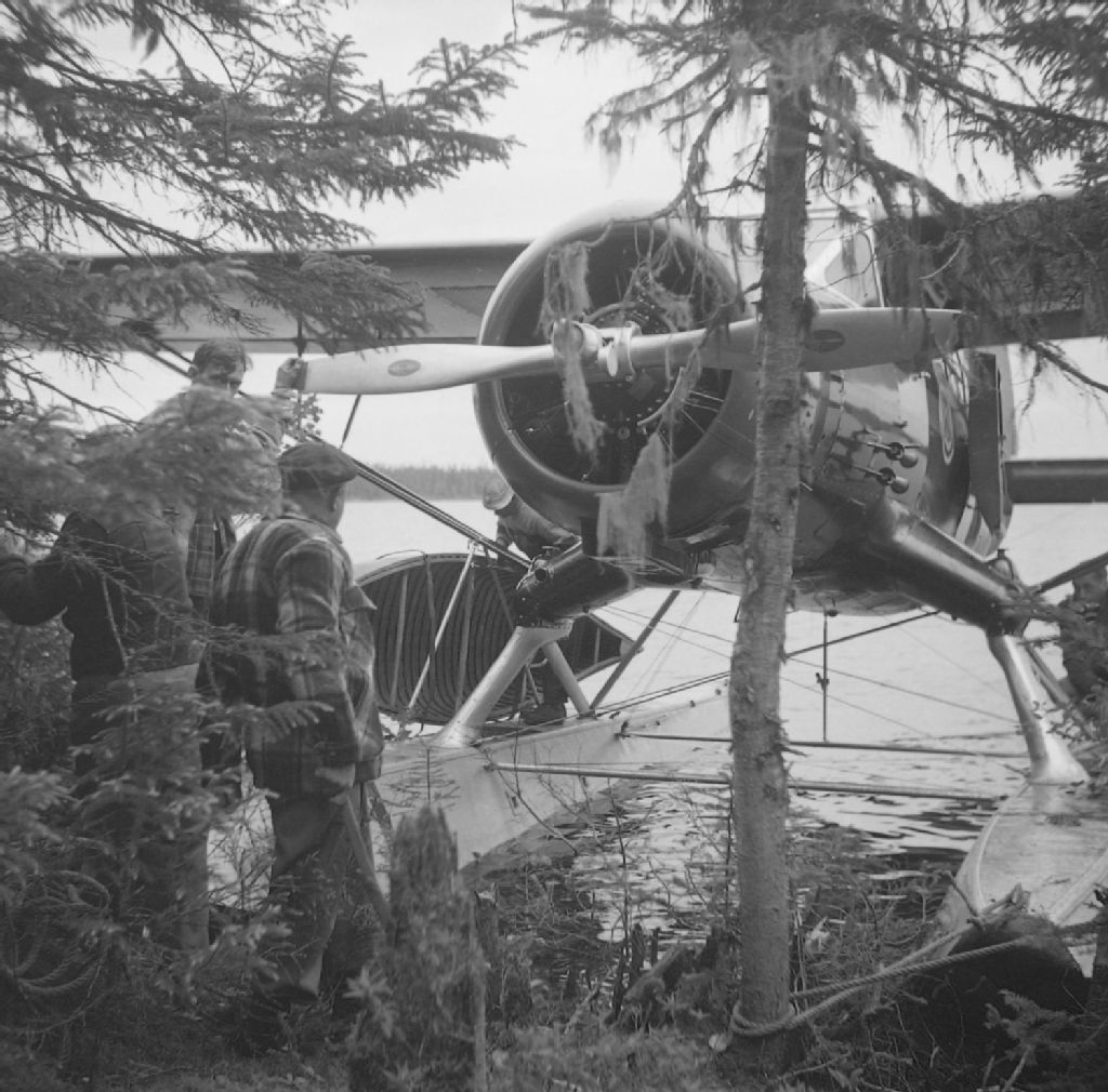 L'hydravion de type Norseman sur la rivière Rupert pendant que l'honorable Camille-Eugène Pouliot, messieurs Gustave Bédard et Armand Tremblay cassent la croûte. Grand Lac Mistassini, 1950, Archives nationales à Québec, Fonds Ministère de la Culture et des Communications, (03Q,E6,S7,SS1,D2,P80221), Gustave Bédard.