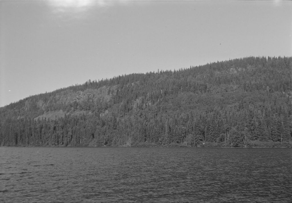 Colline composée de roches sédimentaires protozoiques sur la rive nord du lac Waconichi. Territoire de Mistassini.