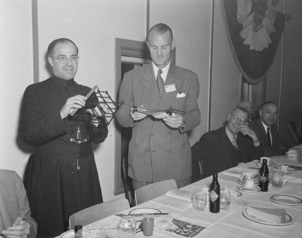 R. P. Lajeunesse O.M.I. recevant de M. Hyndam, gérant de International Harvester, une charrue miniature. Exposition de Québec