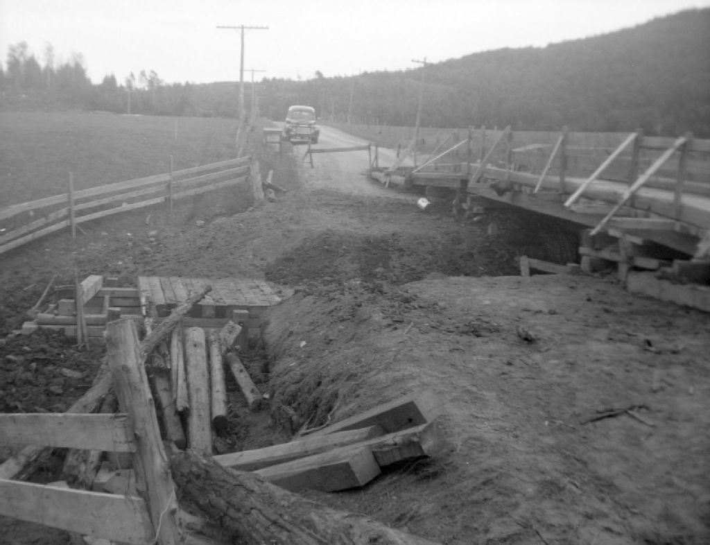 Pont temporaire sur le cours d'eau Edmond Girard sur la route 15 à Petites Bergeronnes, comté de Saguenay, 1950, Archives nationales à Québec, Fonds Ministère de la Culture et des Communications, (03Q,E6,S7,SS1,D2,P80513), Jules Carbonneau.
