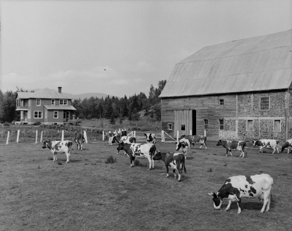Troupeau et bâtisses de ferme chez Édouard Émond à Saint-Jovite, comté Terrebonne.