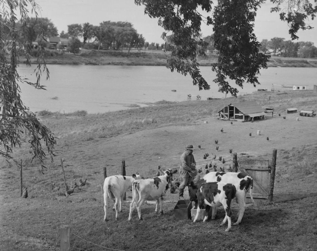 Hector Archambautl avec quelques génisses à Repentigny, comté L'Assomption., 1950, Archives nationales à Québec, Fonds Ministère de la Culture et des Communications, (03Q,E6,S7,SS1,D2,P81030), Omer Beaudoin.