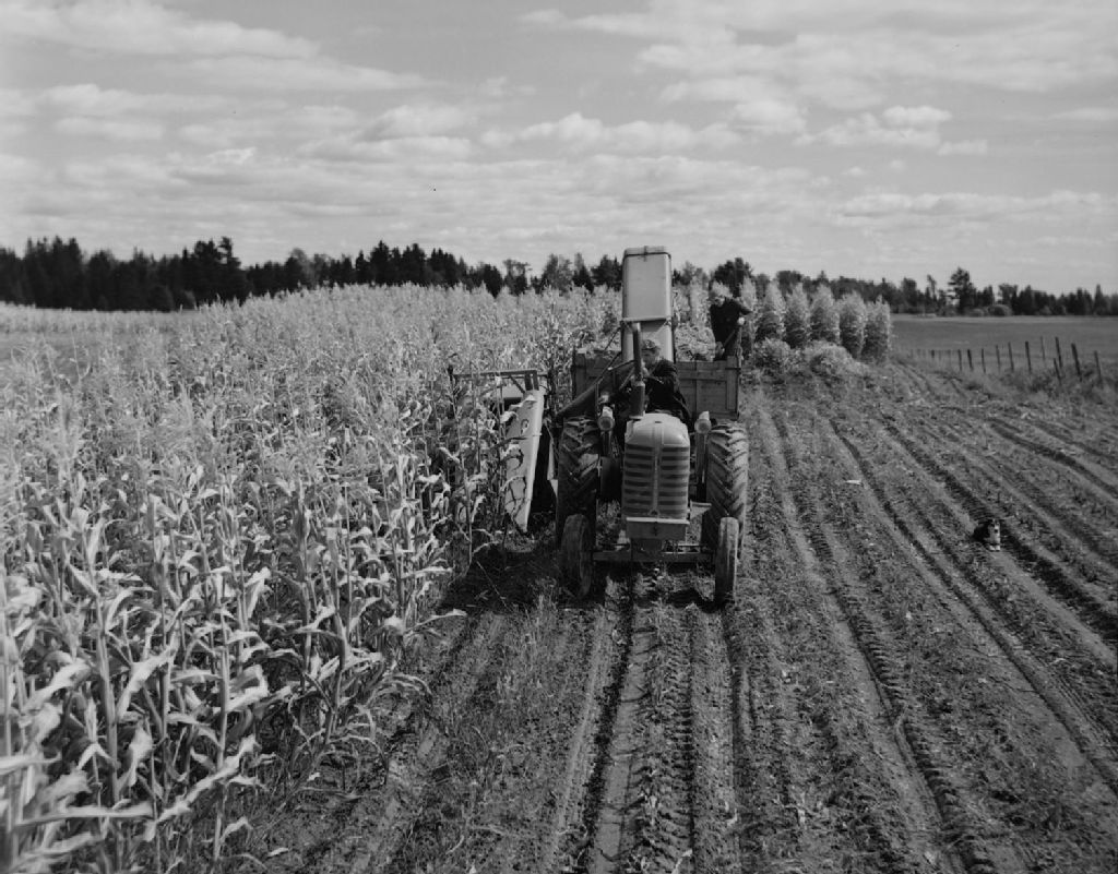 Récolte du maïs à la combine herbagère chez Maurice Martineau à L'Assomption., 1950, Archives nationales à Québec, Fonds Ministère de la Culture et des Communications, (03Q,E6,S7,SS1,D2,P81040), Omer Beaudoin.