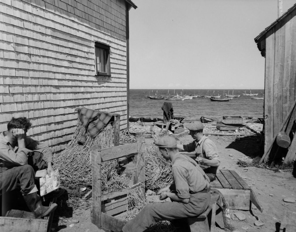 Un pêcheur prépare la palangre pour la pêche en posant les hameçons aux lignes à Cap-des-Rosiers