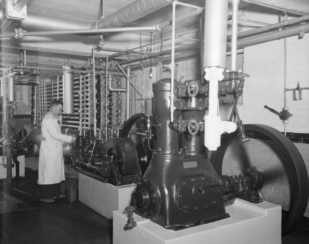 Machinerie d'un entrepôt frigorifique du Département des Pêcheries en Gaspésie, 1950, Archives nationales à Québec, Fonds Ministère de la Culture et des Communications, (03Q,E6,S7,SS1,D2,P81071), Gustave Bédard.