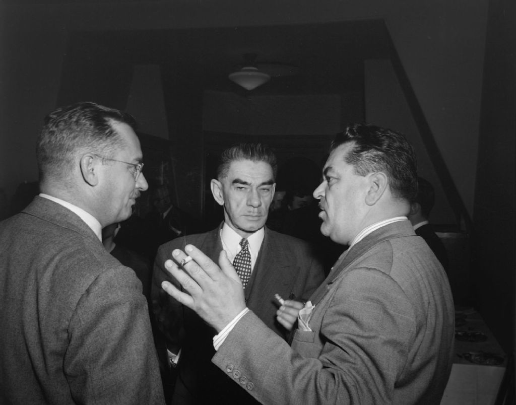 A. Biron de Sherbrooke, DR. B. LaHaye de Québec et J. E. Morin gérant, à l'occasion de la journée d'étude des solliciteurs au 102 Grande-Allée à Québec, 1950, Archives nationales à Québec, Fonds Ministère de la Culture et des Communications, (03Q,E6,S7,SS1,D2,P81105), Neuville Bazin.