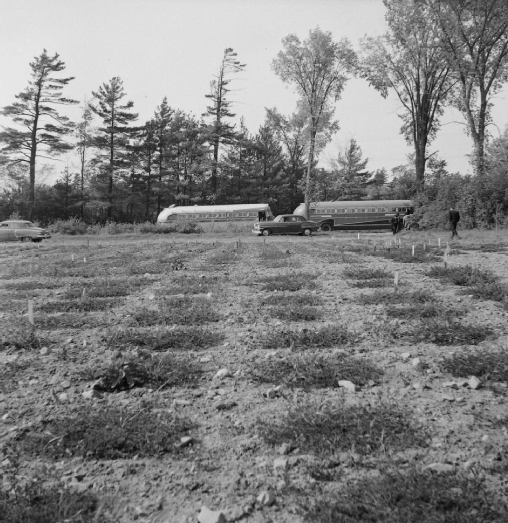 Un groupe d'agriculteurs québécois visite en compagnie de quelques techniciens les sélections de lotier et de lading du professeur Gershow de l'Université de Burlington, Vermont. U.S.A